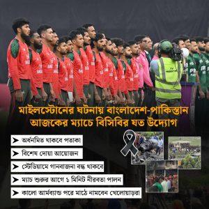 মিরপুর শের-ই বাংলা স্টেডিয়ামে খেলা শুরু হবে সন্ধ্যা ৬টায়। মর্মান্তিক দুর্ঘটনায় শোক ও দোয়া চেয়েছেন দেশ দুটির ক্রিকেটাররা। এদিকে, মাইলস্টোনে হতাহতদের স্মরণে আজ কালো আর্মব্যান্ড পরিধান করে মাঠে নামবেন বাংলাদেশ-পাকিস্তানের ক্রিকেটাররা। এ ছাড়াও রাষ্ট্রীয় শোকের দিনটিকে ঘিরে বিসিবি বেশকিছু পদক্ষেপ নিয়েছে– সকালে মিলাদ ও দোয়া মাহফিল, স্টেডিয়ামসহ বিসিবির সব ভেন্যুতে জাতীয় পতাকা অর্ধনমিত রাখা, খেলার শুরুতে এক মিনিট নীরবতা পালন এবং ম্যাচের মাঝে গান-বাজনা বন্ধ।
