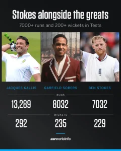এক টেস্টে সেঞ্চুরি ও ৫ উইকেট পাওয়া চতুর্থ ইংলিশ ক্রিকেটার স্টোকস। তাঁর আগে এই কীর্তি ছুঁয়েছেন টনি গ্রেগ, ইয়ান বোথাম ও গাস অ্যাটকিনসন। তাঁরা কেউই দেড়শ রানসহ ৫ উইকেট নিতে পারেননি। স্টোকসের সামনে সেই সুযোগ ছিল । কিন্তু ১৪১ রানে কাটা পড়েন তিনি। তবে ইংল্যান্ডের প্রথম অধিনায়ক হিসেবে এই ক্লাবে যুক্ত হতে পারার স্বাদ নিচ্ছেন তিনি।
