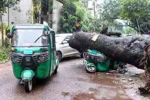 রাজধানীর ধানমন্ডির ৬ নম্বর সড়কে বিশাল আকৃতির একটি গাছ উপড়ে সড়কে থাকা তিনটি গাড়ির ওপর পড়েছে। এতে একটি প্রাইভেট কার, দুটি সিএনজিচালিত অটোরিকশা ও একটি ব্যাটারিচালিত রিকশা ব্যাপকভাবে ক্ষতিগ্রস্ত হয়েছে। গাছের চাপায় অটোরিকশার একজন চালক গুরুতর আহত হয়েছেন। ওই চালককে একটি বেসরকারি হাসপাতালে ভর্তি করা হয়েছে।