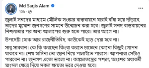ফেসবুক পোস্টে সারজিস বলেন, ‘জুলাই সনদের মাধ্যমে মৌলিক সংস্কার বাস্তবায়নে যারাই বাধা হয়ে দাঁড়াবে, তাদের মুখোশ জনগণের সামনে উন্মোচন করা হবে। জুলাই সনদ বাস্তবায়নের নিশ্চয়তার পর অন্য আলাপের শুরু হতে পারে। তার আগে না। উপদেষ্টা হোক আর রাজনীতিবিদ, কাউকেই ছাড় দেওয়া হবে না।’