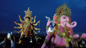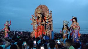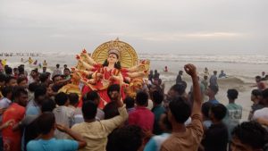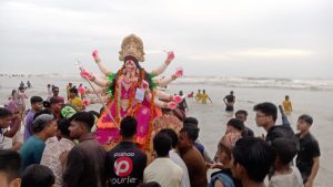 কক্সবাজার সমুদ্র সৈকতে দেশের সর্ববৃহৎ প্রতিমা বিসর্জনের মাধ্যমে শেষ হলো শারদীয় দুর্গোৎসব। চারদিনের পূজা-অর্চনার আনুষ্ঠানিকতা শেষে পঞ্চম দিনে মর্ত্যলোক থেকে বিদায় নেন দেবী দুর্গা। বৃহস্পতিবার (২ অক্টোবর) মেঘাচ্ছন্ন বিকেলে লাবণী পয়েন্টে উন্মুক্ত মঞ্চে আয়োজন করা হয় এই প্রতিমা বিসর্জন অনুষ্ঠান।