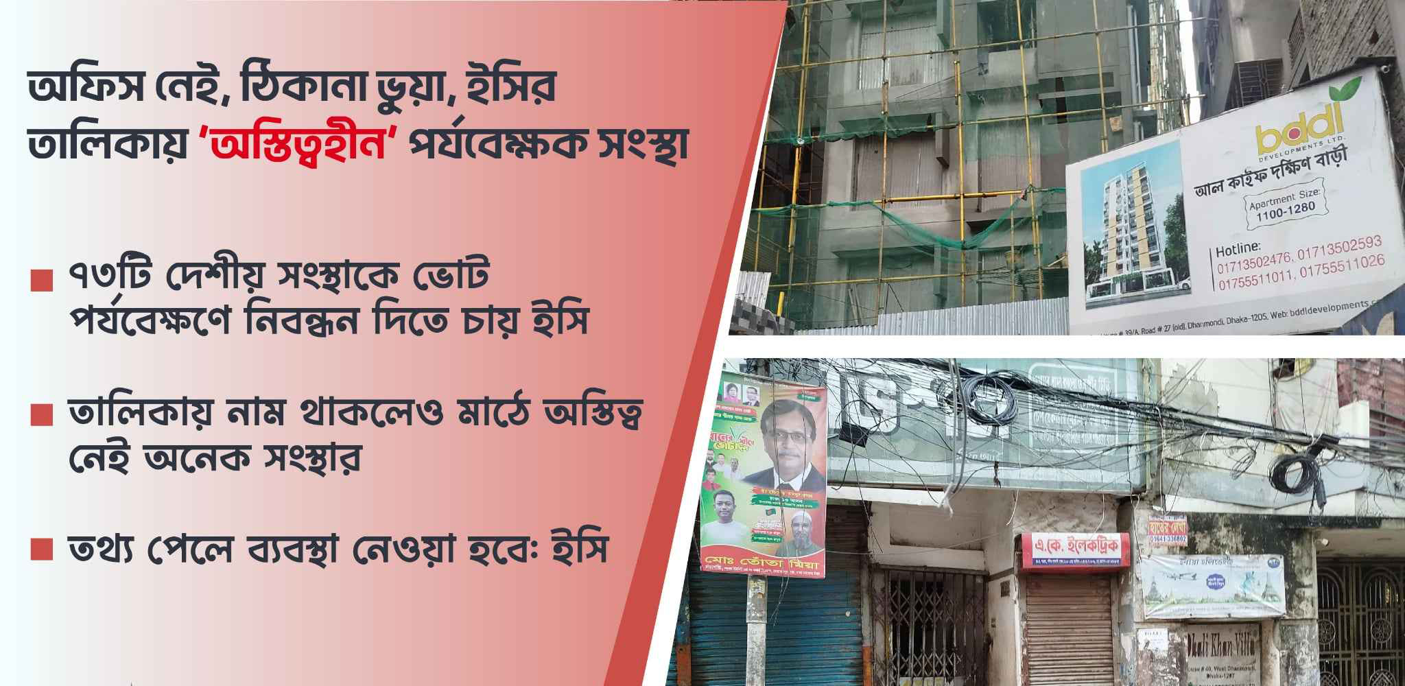 আগামী জাতীয় সংসদ নির্বাচন স্বচ্ছ ও অবাধ করার লক্ষ্যে ৭৩টি দেশীয় পর্যবেক্ষক সংস্থাকে ভোট পর্যবেক্ষণের নিবন্ধন দিতে চায় নির্বাচন কমিশন (ইসি)। কিন্তু এদের মধ্যে অনেক সংস্থারই মাঠপর্যায়ে অস্তিত্ব নেই। কোথাও অফিসের ঠিকানায় পাওয়া যাচ্ছে ইলেকট্রনিকস পণ্যের দোকান, কোথাও আবার আবাসিক ভবন। কিছু সংস্থার ঠিকানা নিয়েও তৈরি হয়েছে গোলকধাঁধা।