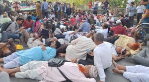 এ সময় আন্দোলনকারী শিক্ষকদের কয়েকজন সড়কে বসে ও কজন শুয়ে পড়েন। দাবি আদায়ে তারা বিভিন্ন স্লোগান দিতে থাকেন।