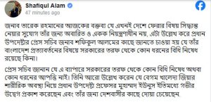 পোস্টে তিনি লেখেন, জনাব তারেক রহমানের আজকের বক্তব্য যে এখনই দেশে ফেরার বিষয়ে সিদ্ধান্ত নেয়ার সুযোগ তার জন্য অবারিত ও একক নিয়ন্ত্রণাধীন নয়, এটা উল্লেখ করে প্রধান উপদেষ্টার প্রেস সচিব জনাব শফিকুল আলমের কাছে জানতে চাওয়া হয় যে তার বাংলাদেশ প্রত্যাবর্তনের বিষয়ে সরকারের তরফ থেকে কোনো ধরনের বিধি নিষেধ রয়েছে কিনা।