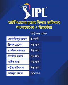 বাংলাদেশের ৭ ক্রিকেটার নিলামের জন্য চূড়ান্ত হয়েছেন—মোস্তাফিজুর রহমান, রিশাদ হোসেন, তাসকিন আহমেদ, নাহিদ রানা, তানজিম হাসান, রাকিবুল হাসান ও শরীফুল ইসলাম। প্রাথমিক তালিকায় থাকলেও নিলামের চূড়ান্ত তালিকায় জায়গা হয়নি সাকিব আল হাসানের।