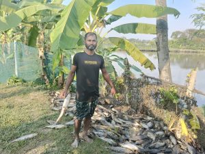 ফিসারির পাড়ে থাকা মরা মাছের এসব স্তুপ যেন একেকটি চাষির স্বপ্নভঙ্গের চিত্র। শুরুতে কিছু মাছ মাটিচাপা দেওয়া হলেও এখন আর সামাল দিতে পারছেন না তাঁরা। ফলে যত্রতত্র মৃত মাছ পড়ে থাকার কারণে দ্রুত ছড়িয়ে পড়ছে দুর্গন্ধ, ব্যাকটেরিয়া, মশা-মাছি ও পশুপাখির উপদ্রব। এতে পুরো এলাকায় দেখা দিয়েছে তীব্র স্বাস্থ্যঝুঁকি।
