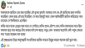 ওই পোস্টে ফাতিমা তাসনিম জুমা লিখেছেন, ‘এই খুনের জন্যই ফয়সালকে জামিনে বের করা হয়েছিল। সরকারে বসা কে এই জামিনের জন্য তদবির করেছিল? কোন জজ এই রায় দিয়েছিল? সে কার রিক্রুট করা? কোন আইনজীবী জামিন করিয়েছে? কার চ্যানেলে সে ইনকিলাবে এসেছিল?’
