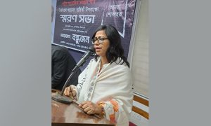 জাতীয় প্রেস ক্লাবের মাওলানা মুহাম্মাদ আকরম খাঁ হলে প্রয়াত সাংবাদিক ফরহাদ খাঁর স্মরণসভায় তাঁর স্মৃতির প্রতি গভীর শ্রদ্ধা নিবেদন করে বক্তব্য রাখছেন জয়া শহীদ