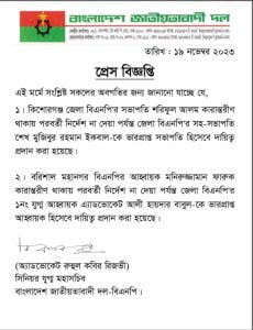 এতে বলা হয়, কিশোরগঞ্জ জেলা বিএনপির সভাপতি শরিফুল আলম কারাগারে থাকায় পরবর্তী নির্দেশ না দেওয়া পর্যন্ত জেলা বিএনপির সহসভাপতি শেখ মুজিবুর রহমান ইকবালকে ভারপ্রাপ্ত সভাপতি হিসেবে দায়িত্ব দেওয়া হলো।
