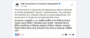 যুক্তরাষ্ট্রের কয়েকজন নাগরিক ব্যক্তিগতভাবে বাংলাদেশের নির্বাচন দেখতে এসেছিলেন। তারা নিজেদের কিংবা তাদের সংগঠনের হয়ে কথা বলেছেন। তাদের বক্তব্যের সঙ্গে যুক্তরাষ্ট্র সরকারের কোনো সম্পর্ক নেই। ঢাকায় নিযুক্ত কানাডার হাইকমিশন ফেসবুক বার্তায় জানিয়েছে, নির্বাচন পর্যবেক্ষক হিসেবে কানাডার যে দুই নাগরিকের কথা বিভিন্ন মাধ্যমে বলা হচ্ছে, তারা স্বতন্ত্রভাবে নির্বাচন পর্যবেক্ষণ করেছেন। তাই নির্বাচনের বিষয়ে তাদের (দুই পর্যবেক্ষক) মতামতের সঙ্গে কানাডা সরকারের কোনো সংশ্লিষ্টতা নেই। রোববার (৭ জানুয়ারি) অনুষ্ঠিত নির্বাচনে আমন্ত্রিত পর্যবেক্ষক হিসেবে বিভিন্ন কেন্দ্র ঘুরে দেখেন বিভিন্ন দেশ ও আন্তর্জাতিক সংস্থার পর্যবেক্ষকেরা। পরে সন্ধ্যায় রাজধানীর একটি হোটেলে সংবাদ সম্মেলন করেন তারা। ওই সংবাদ সম্মেলনে অংশ নেন মার্কিন কংগ্রেসের সাবেক সদস্য জিম বেটস, যুক্তরাষ্ট্রের আরেক পর্যবেক্ষক এবং আমেরিকান গ্লোবাল স্ট্র্যাটেজিসের প্রধান নির্বাহী আলেক্সান্ডার গ্রে, কানাডার পার্লামেন্ট সদস্য চন্দ্রকান্ত আর্য ও সিনেটর ভিক্টর ওহ।