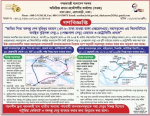 মঙ্গলবার (৬ ফেব্রুয়ারি) এ বিষয়ে সড়ক ও জনপথ অধিদপ্তরের ঢাকা জোনের অতিরিক্ত প্রধান প্রকৌশলীর কার্যালয় থেকে গণবিজ্ঞপ্তি জারি করা হয়।