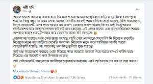 সেখানে তিনি লিখেছেন, ‘শুনলে হয়তো অনেকে অবাক হবে, চিরকাল শত্রুরা আমার আত্মবিশ্বাস বাড়িয়েছে। কিংবা হয়তো পুরো শত্রু না, কিন্তু বন্ধুও না এমন লোক, যাদের নেগেটিভ কমেন্ট আমার দিকে ধেয়ে আসছে, বিশ্রি সমালোচনা, কিংবা জাজমেন্ট- এসব শুনে আমার মন খারাপ, মেজাজ খারাপ হয়েছে কি হয় নাই; কিন্তু আমার ডেডিকেশন আর আত্মসচেতনতা ধাই ধাই করে বেড়েছে- এই এদের জন্যে। এরা আসলে চিরকাল আমার অপকার করতে চেয়ে উপকার করে ফেলছে। আহা, যদি জানতো!’