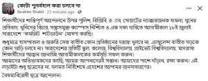 বিবৃতিতে বলা হয়, “শিক্ষার্থীদের শান্তিপূর্ণ আন্দোলনের ওপর পুলিশ, বিজিবি, র্যাব, সোয়াটের ন্যাক্কারজনক হামলা, খুনের প্রতিবাদ, খুনিদের বিচার, সন্ত্রাসমুক্ত ক্যাম্পাস নিশ্চিত করা এবং কোটা সংস্কারের এক দফা দাবিতে আগামীকাল (১৮ জুলাই) সারা দেশে ‘কমপ্লিট শাটডাউন’ ঘোষণা করছি।”
