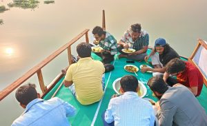 দ্বীপটির প্রাকৃতিক সৌন্দর্য এবং এর মায়ায় আবেগে ভেসে যাওয়ার মতো একটি দিন কাটানোর পর, আমরা ঘোরাঘুরি শেষ করে আবারও সোনার তরীতে ফিরে যাই। সেখান থেকে শুরু হয় আমাদের দুপুরের খাবারের আয়োজন। সবুজ বাংলা এক্সপ্লোরাসের পক্ষ থেকে দুপুরের খাবারের যে ব্যবস্থা করা হয়েছিল, তা সত্যিই প্রশংসনীয়। শীতের দুপুরে নদীর মাঝে এমন খাবারের আয়োজন নিঃসন্দেহে আমাদের মুগ্ধ করেছে। গরম ভাতের সাথে সুস্বাদু হাসের মাংস, ভর্তা এবং ভাজি সবকিছুই যেন আমাদের দিনটিকে আরও আনন্দময় করে তুলেছিল। খাবারের প্রতিটি আইটেমই তাজা ও মনোমুগ্ধকর ছিল, যা প্রমাণ করে যে আয়োজকরা আমাদের আরাম এবং সন্তুষ্টির প্রতি কতটা মনোযোগী। নদীর বুকে এমন পরিবেশে দুপুরের খাবার খাওয়ার অভিজ্ঞতা একেবারেই অনন্য এবং চিরস্মরণীয়।