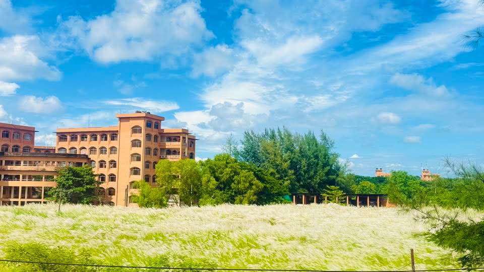 ববির লাল ইটের প্রাচীর এর মাঝে কাশফুল যেন এক টুকরো সাদা স্বর্গ