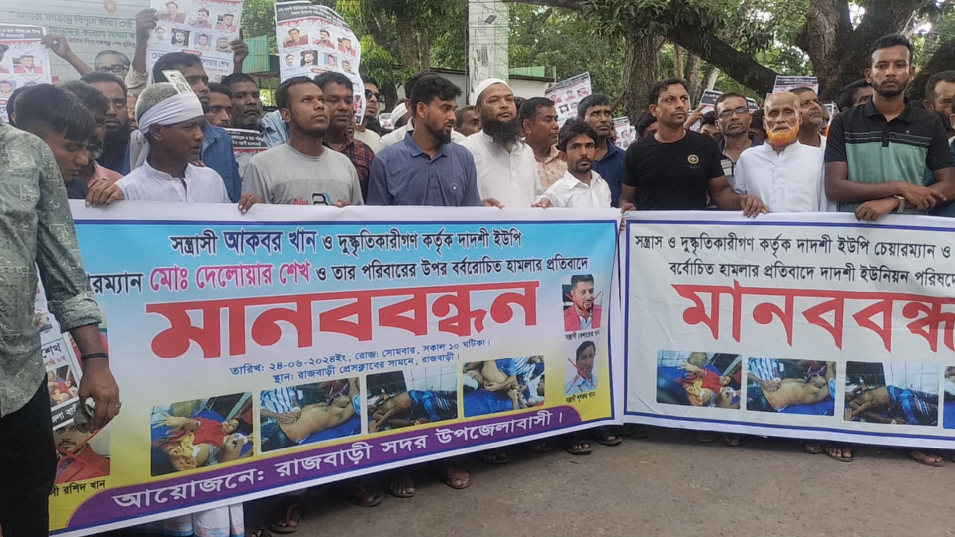 রাজবাড়ীতে ইউপি চেয়ারম্যানসহ ৪ জনের উপর হামলায় অভিযুক্তদের গ্রেপ্তারের দাবিতে মানববন্ধন
