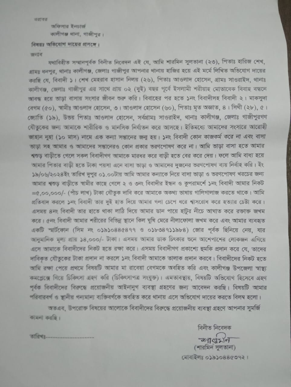 কালীগঞ্জে যৌতুকের দাবীতে গৃহবধুকে শ্বাসরোধে হত্যার চেষ্টা