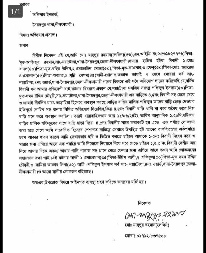 সৈয়দপুরে সাংবাদিক কে হুমকি, থানায় অভিযোগ