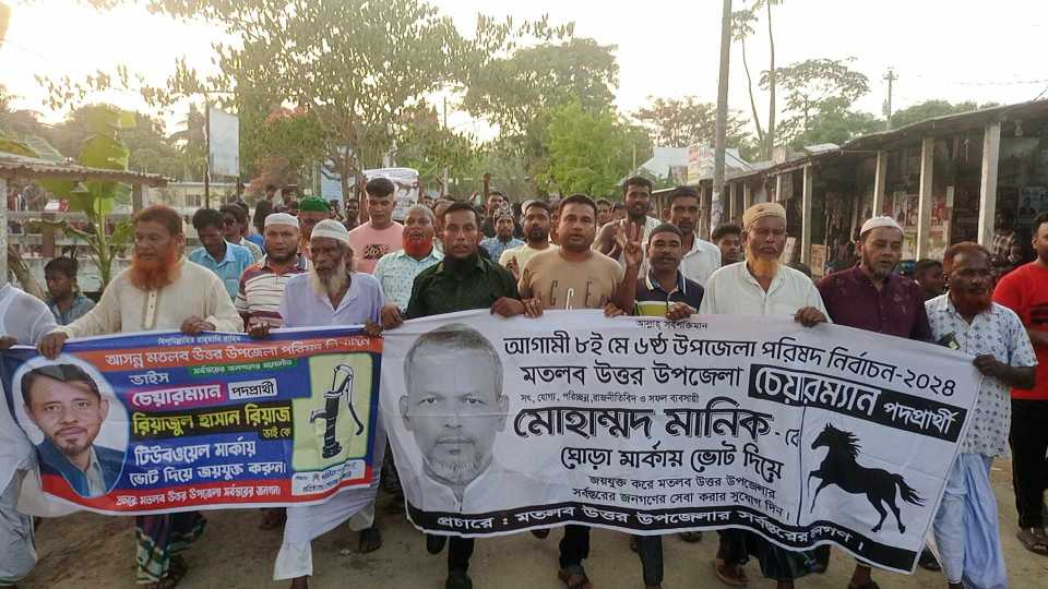 মতলব উত্তরে ঘনিয়ার পাড়ে ঘোড়া ও টিউবওয়েল মার্কার সমর্থনে মিছিল ও গনসংযোগ