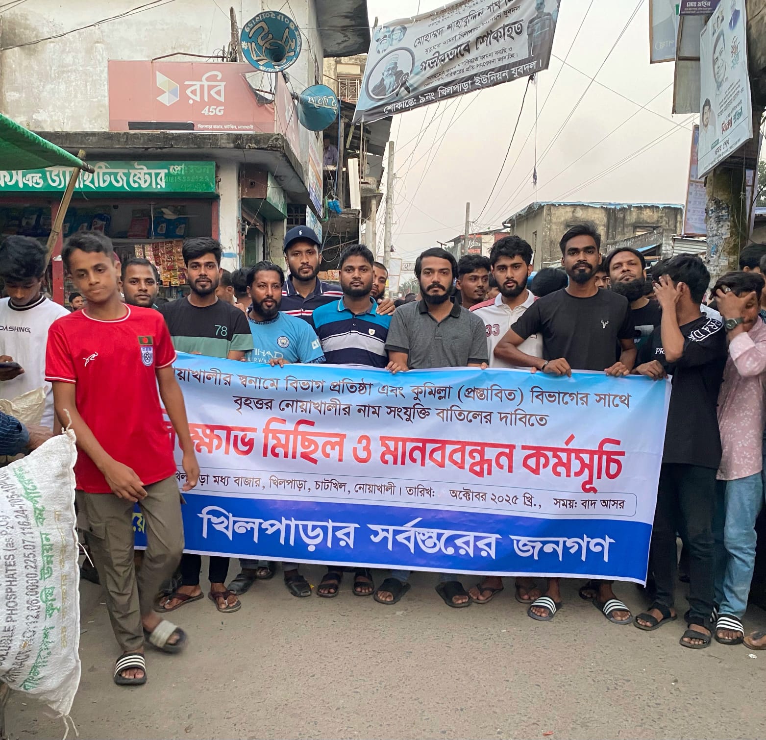 নোয়াখালীর স্বনামে বিভাগ দাবিতে চাটখিল বিক্ষোভ মিছিল ও মানববন্ধন