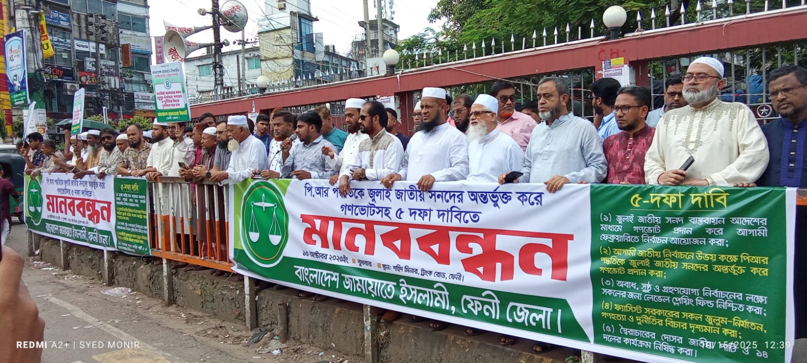 ফেনীতে জেলা জামায়াতের পাঁচ দফা দাবীতে মানববন্ধন ও প্রতিবাদ সমাবেশ