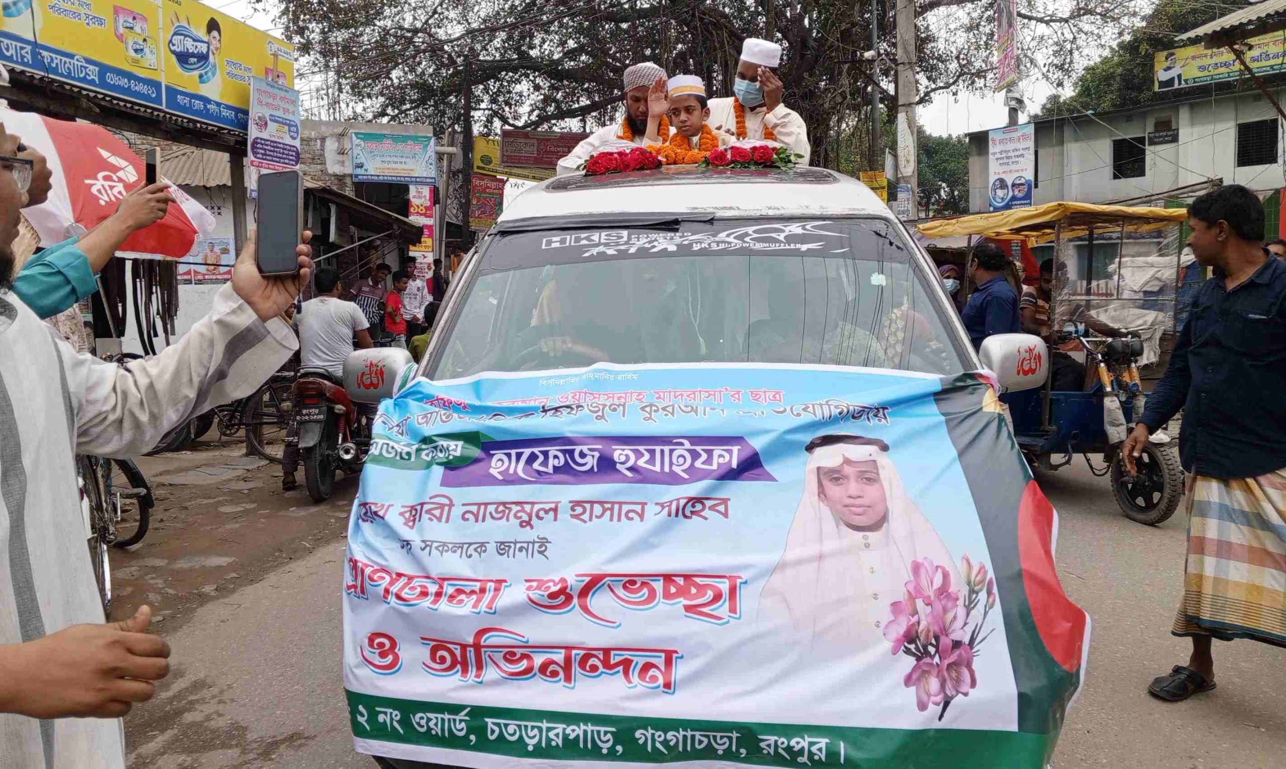 রংপুরে বিশ্বজয়ী হাফেজ হুজাইফাকে ফুলেল শুভেচ্ছা