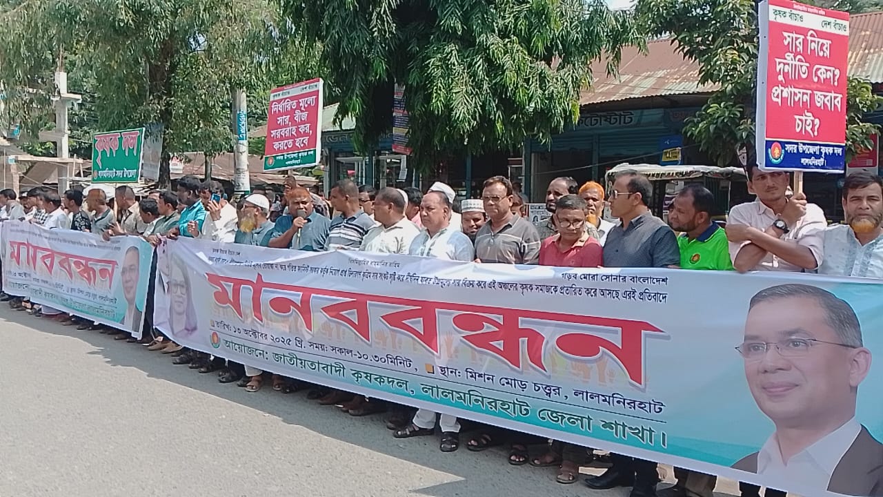 লালমনিরহাটে কৃত্রিম সার সংকটের প্রতিবাদে কৃষকদের মানববন্ধন