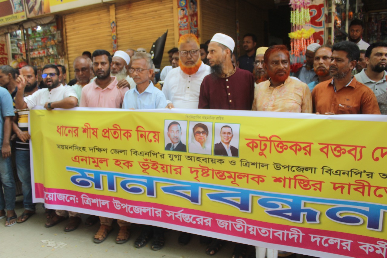 ত্রিশালে বিএনপি আহ্বায়কের কটূক্তিতে ক্ষোভ, শাস্তির দাবিতে মানববন্ধন