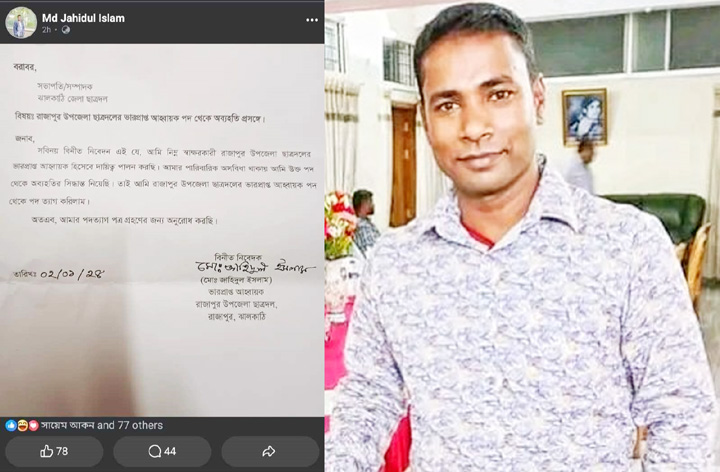 রাজাপুর উপজেলা ছাত্রদলের অহব্বায়কের দল থেকে পদত্যাগ