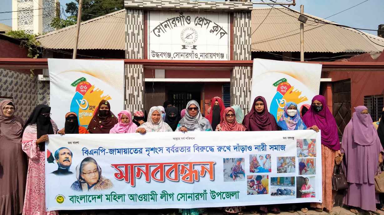 সোনারগাঁ উপজেলা মহিলা আ’লীগের মানববন্ধন ও শান্তি মিছিল