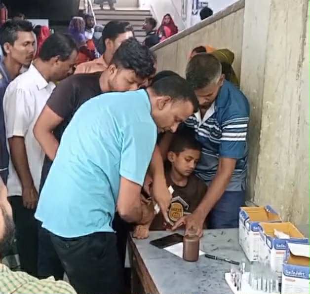 যশোর ২৫০ শয্যা হাসপাতাল প্যাথলজি বিভাগে রোগীর ব্লাড নিচ্ছেন সুইপার