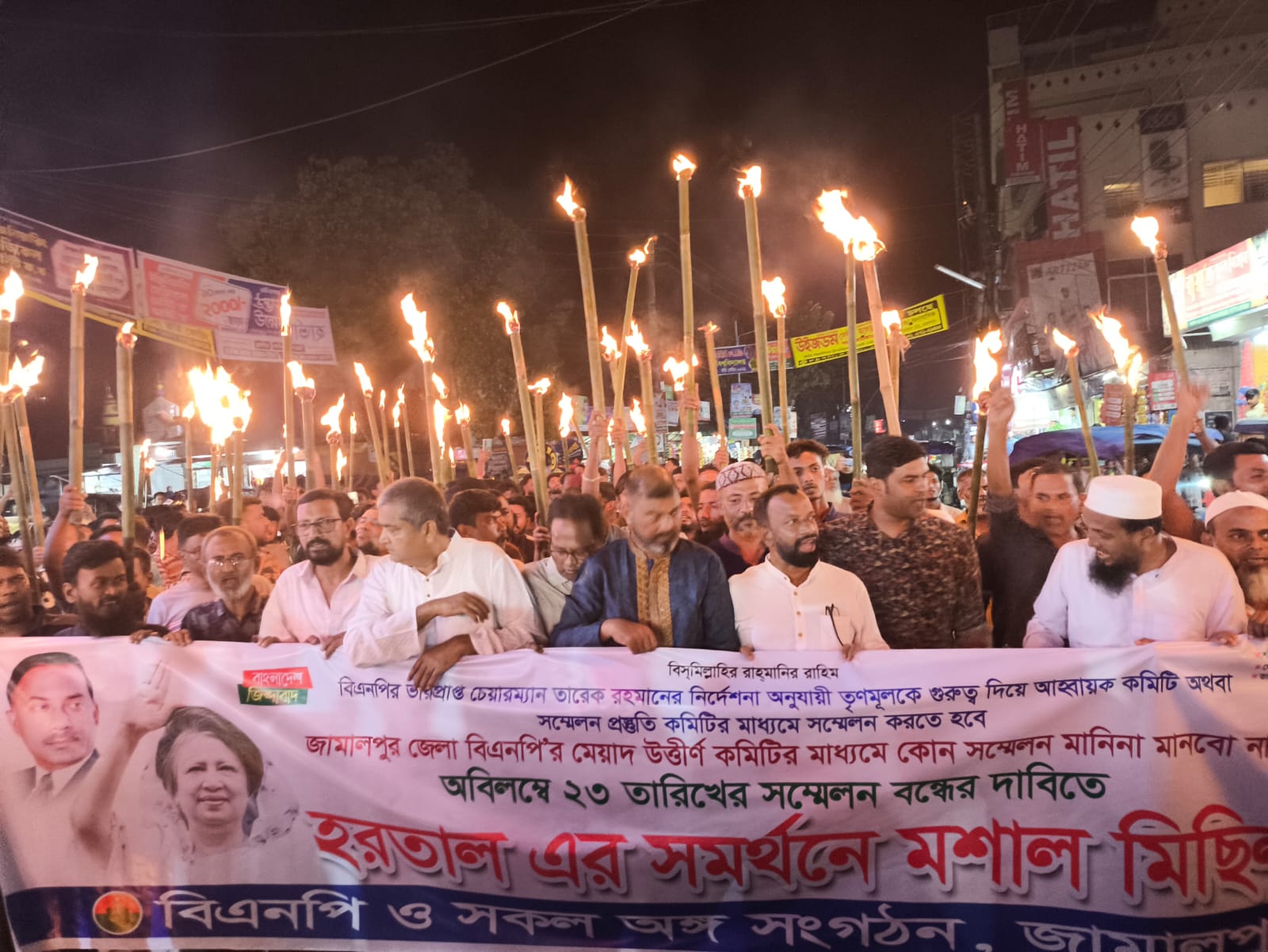 জামালপুরে বিএনপির সম্মেলন বাতিলের দাবীতে মশাল মিছিল, ককটেল বিস্ফোরন