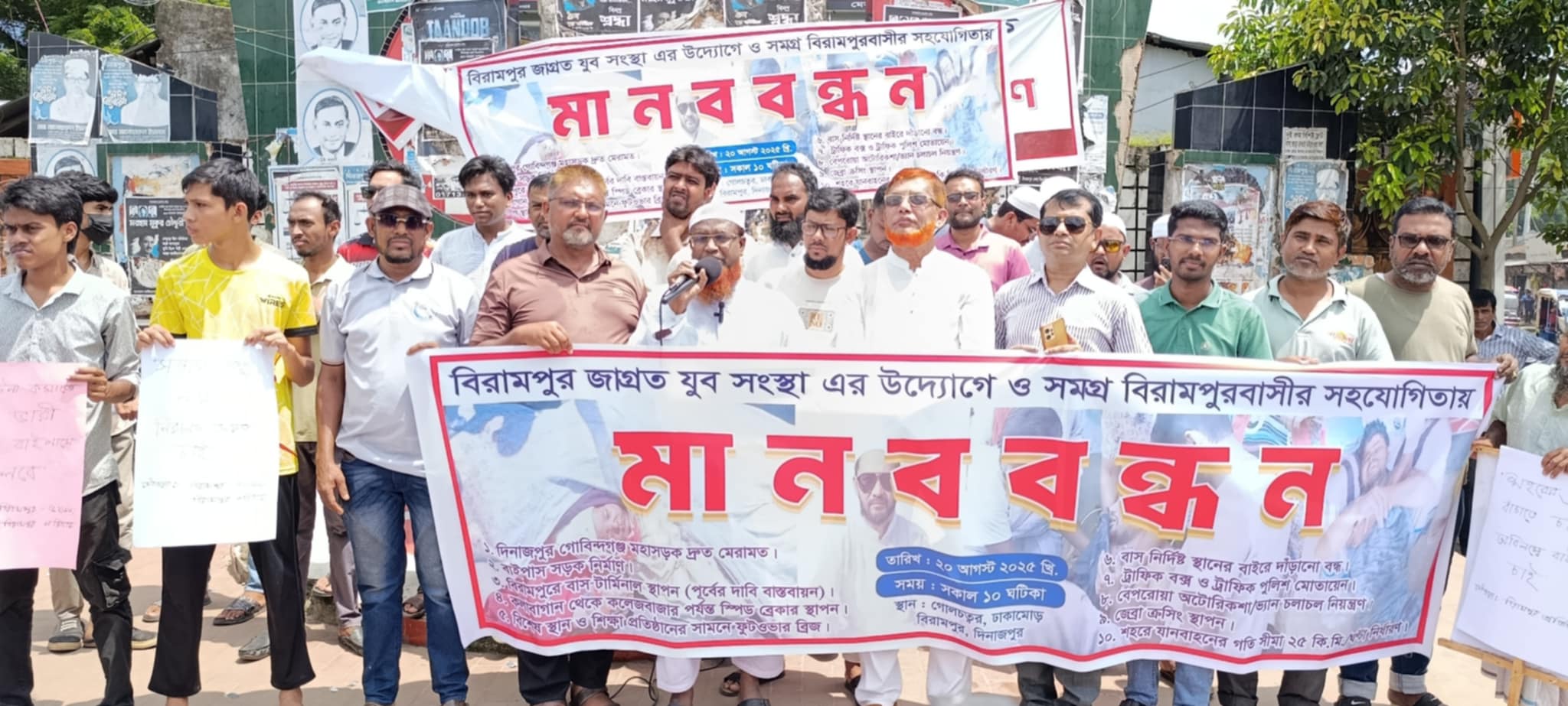 বিরামপুরে সড়ক দুর্ঘটনা রোধে ১০ দফা দাবিতে মানববন্ধন ও স্মারকলিপি প্রদান