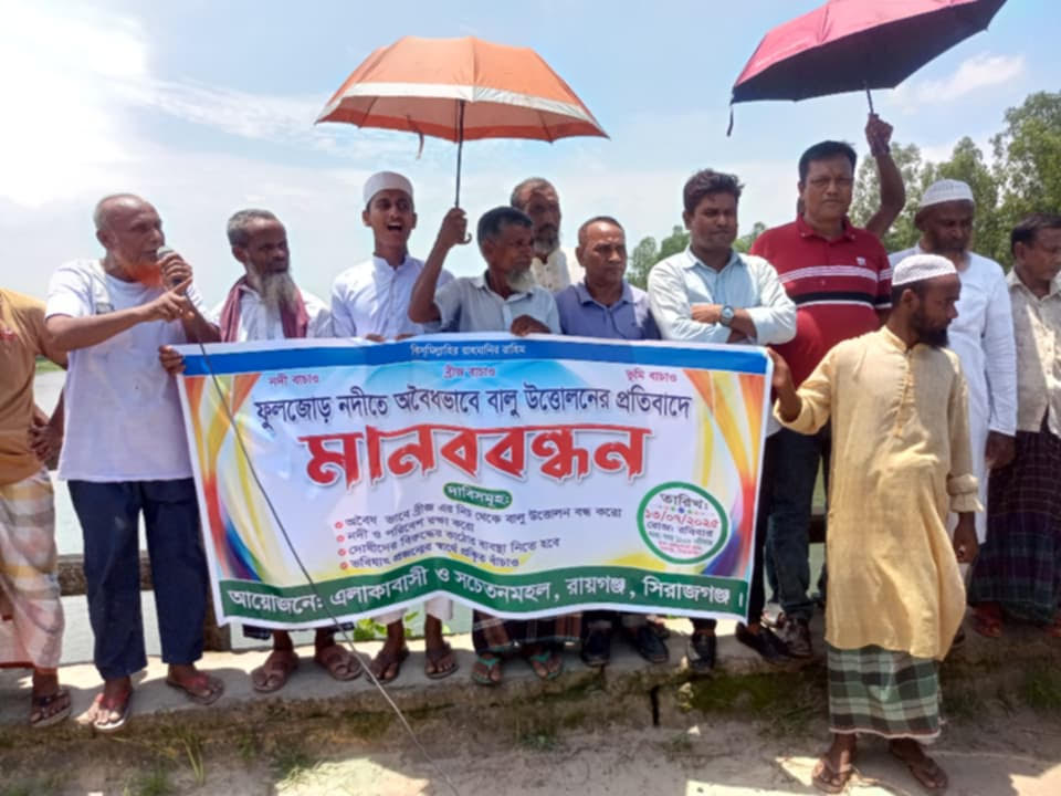 রায়গঞ্জে ফুলজোড় নদীতে অবৈধভাবে বালু উত্তোলনের প্রতিবাদে মানববন্ধন