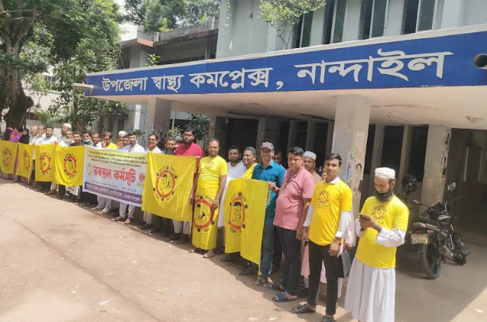 নান্দাইলে ৬ দফা দাবিতে স্বাস্থ্য সহকারীদের দুই ঘণ্টার অবস্থান কর্মসূচি