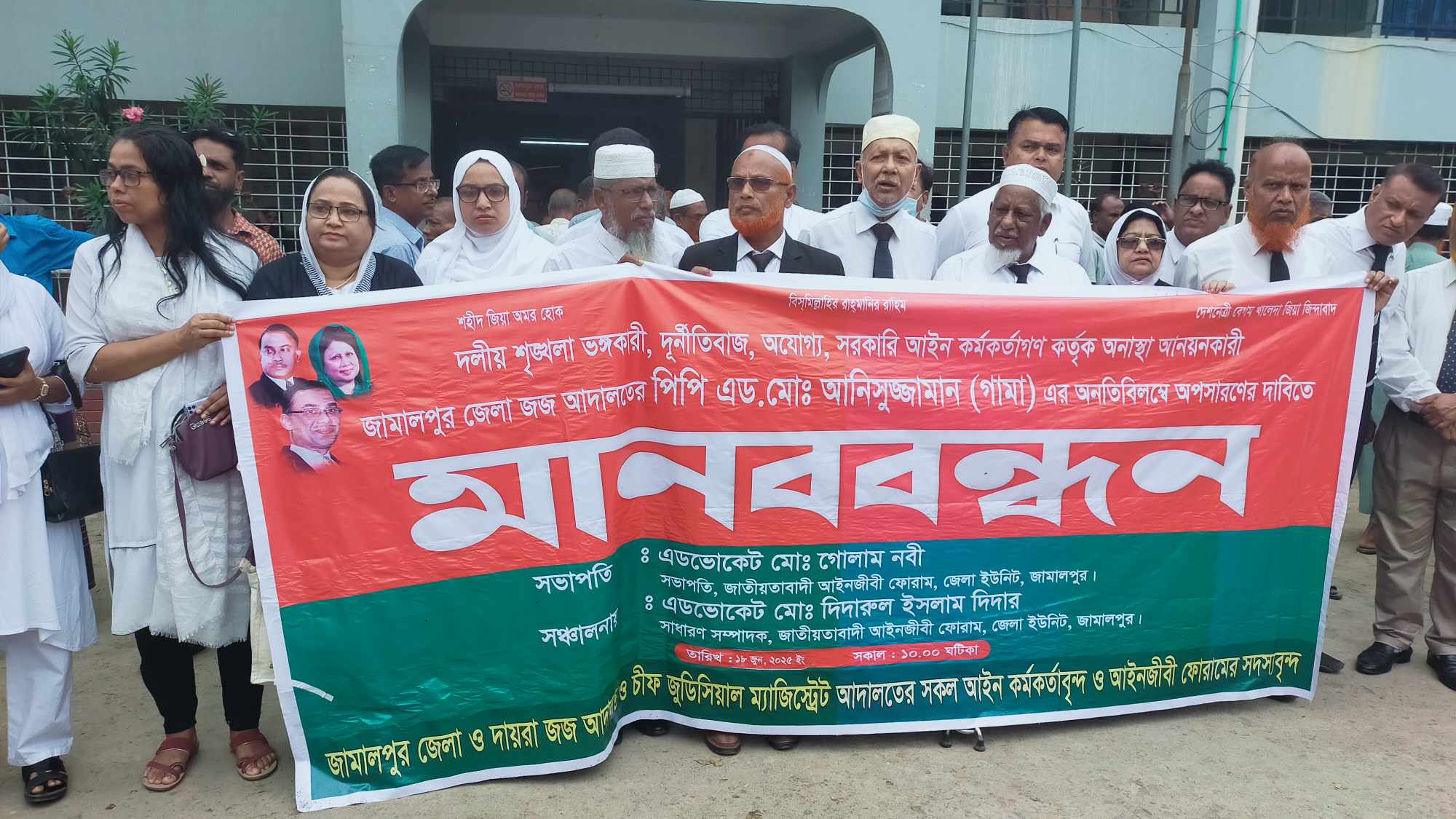 জামালপুরে জজ কোর্টের পিপি আনিসুজ্জামানের অপসারণ দাবিতে মানববন্ধন