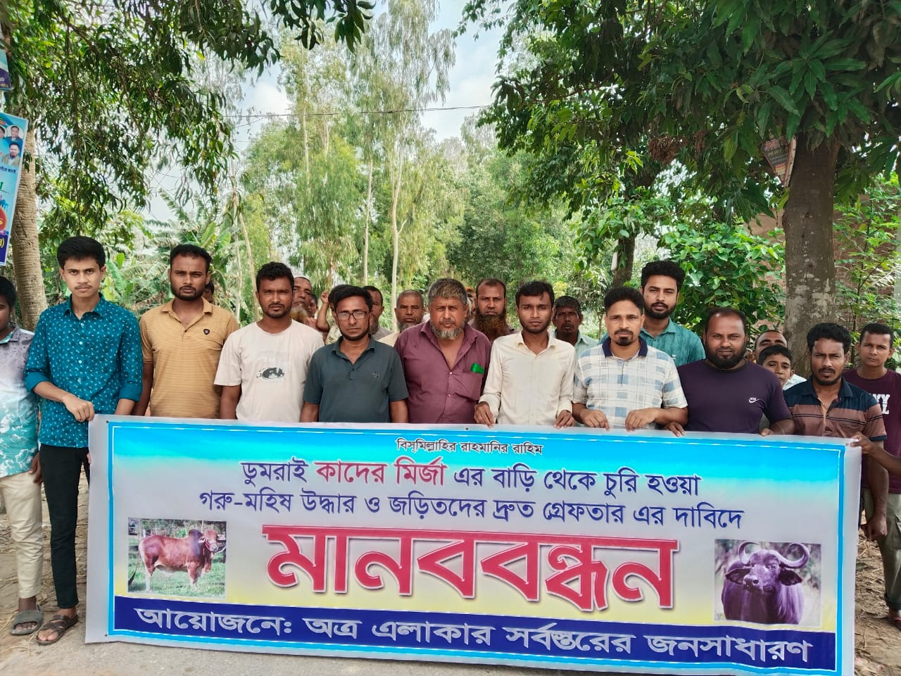 রায়গঞ্জে চুরি হওয়া গরু-মহিষ উদ্ধার ও জড়িতদের দ্রুত গ্রেফতারের দাবিতে মানববন্ধন