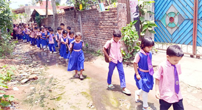 শিশুদের স্কুলে যেতে হয় ময়লা ও দুর্গন্ধযুক্ত পানি ডিঙ্গিয়ে