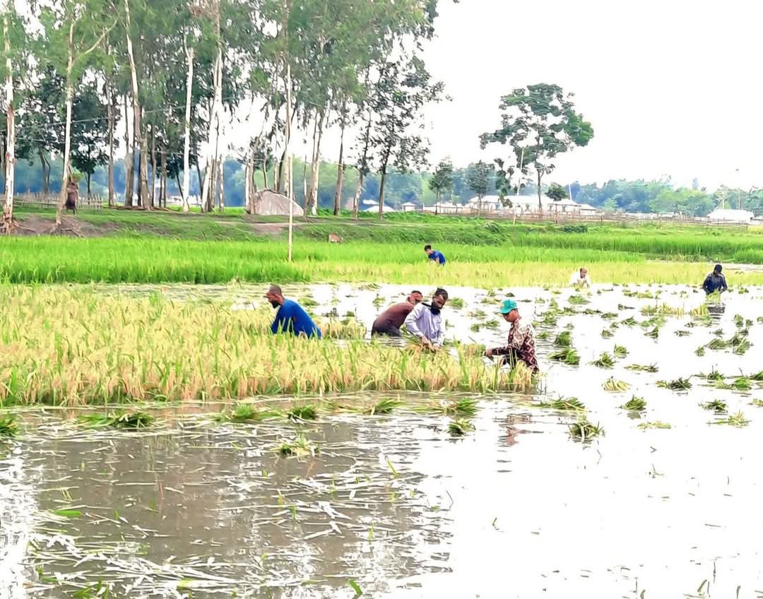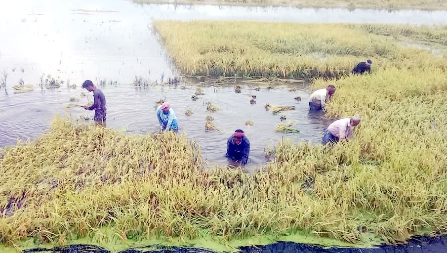 নীলফামারীতে অসময়ে পানি বৃদ্ধি হাঁটু পানিতে ধান কাটছেন কৃষক