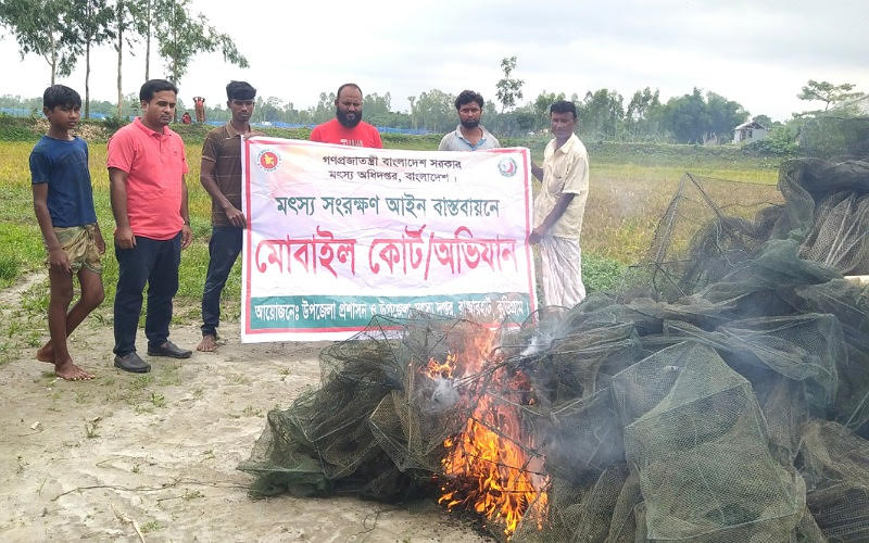 রাজারহাটে মাছ ধরার অবৈধ রিং জাল পুড়িয়ে দেওয়া হয়