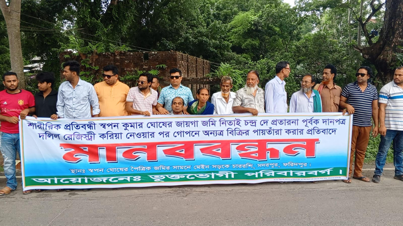 সদরপুরে প্রতিবন্ধীর জমি আত্মসাতের প্রতিবাদে এলাকাবাসীর মানববন্ধন