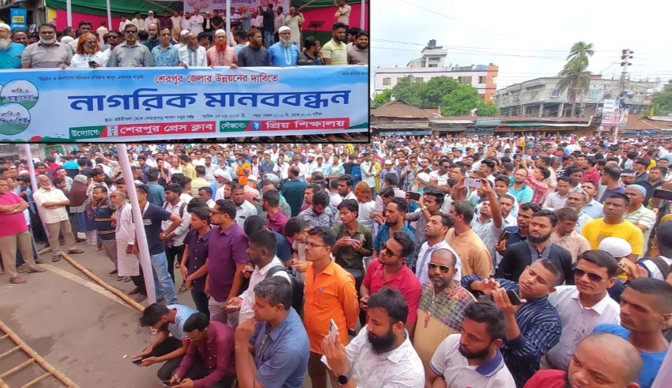 শেরপুরের যৌক্তিক উন্নয়নের দাবিতে মানববন্ধন