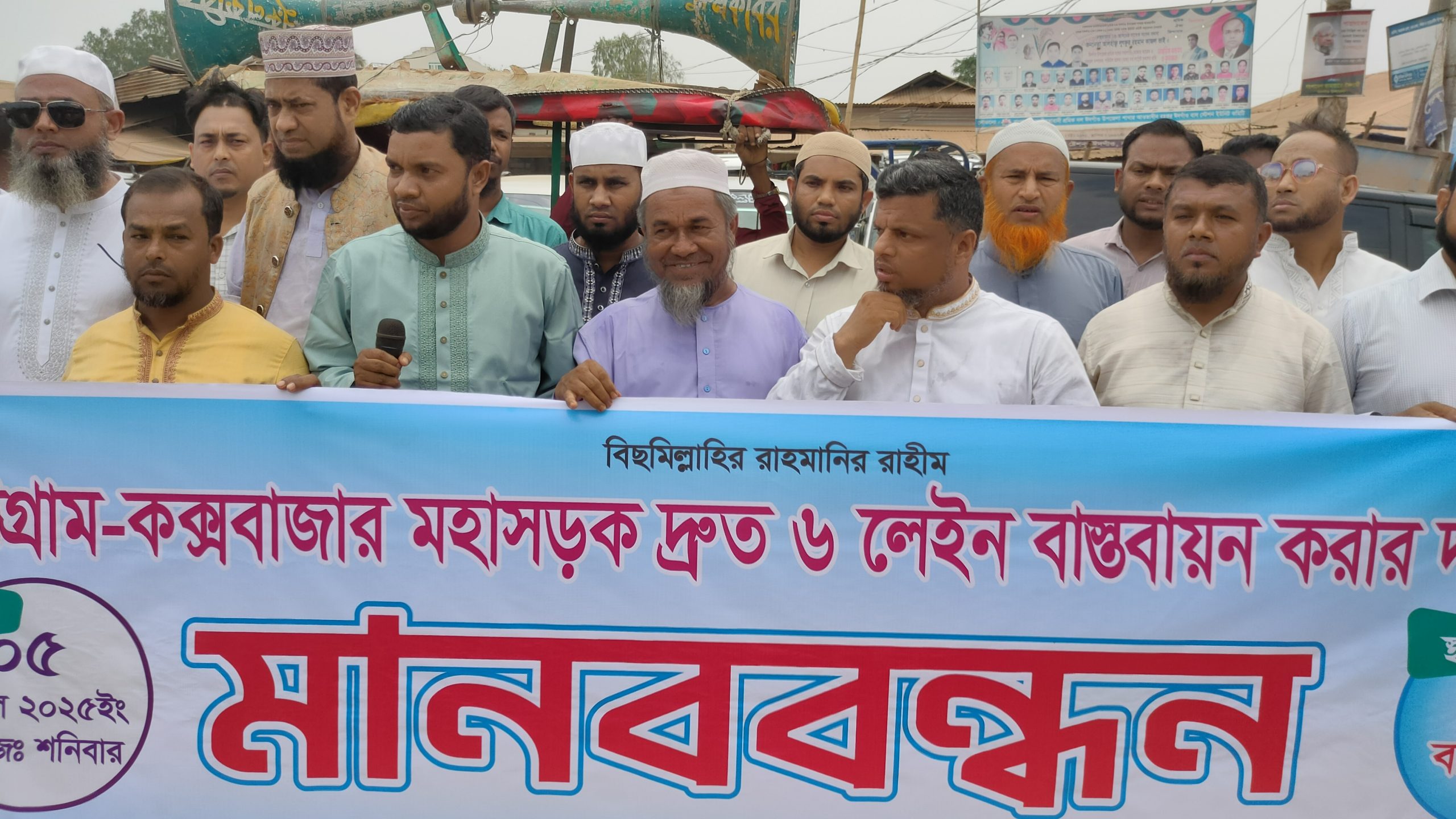 চট্টগ্রাম-কক্সবাজার মহাসড়কে ৬ লেইন বাস্তবায়ন দাবিঃ ঈদগাঁওতে মানববন্ধন