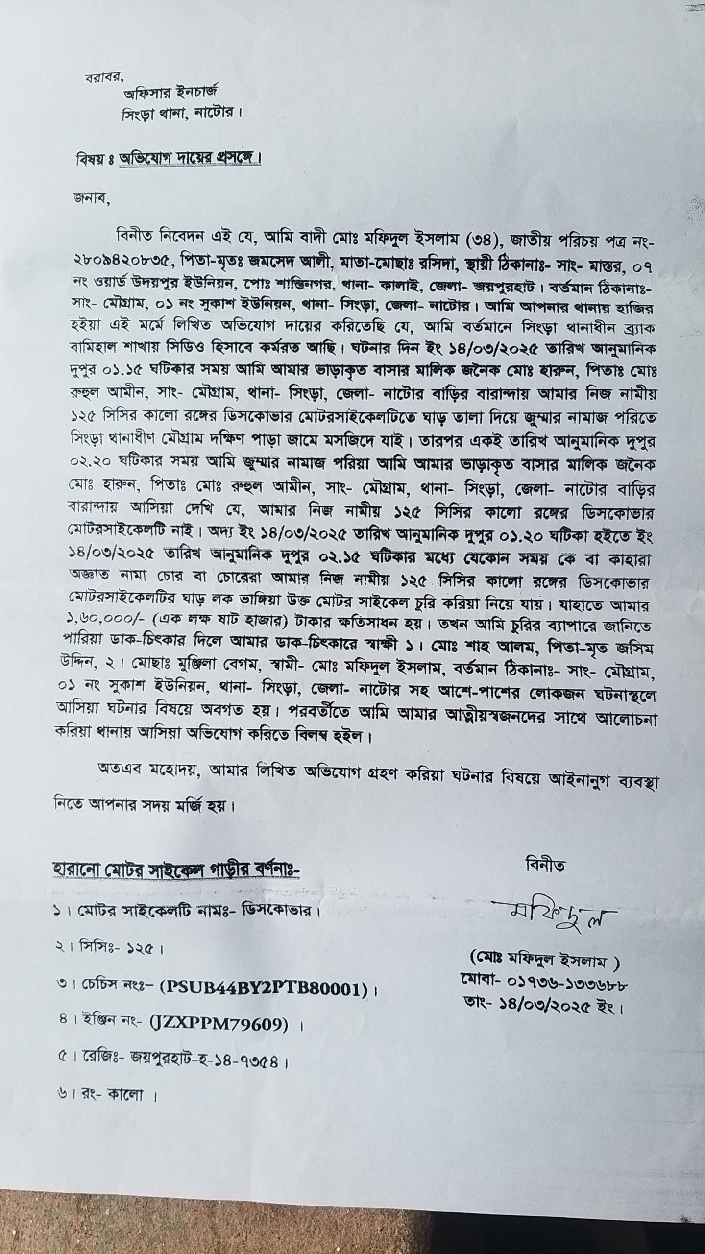 সিংড়া সুকাশ ইউনিয়নের মৌগ্রামে মটর সাইকেল চুরি থানায় অভিযোগ