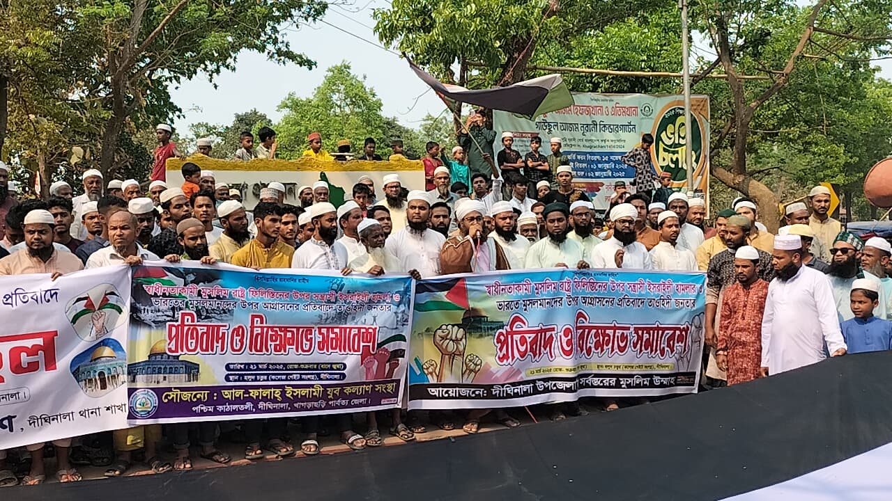 ফিলিন্তিনের ও ভারতে মুসলমানের উপর হামলার প্রতিবাদে দীঘিনালায় বিক্ষোভ সমাবেশ