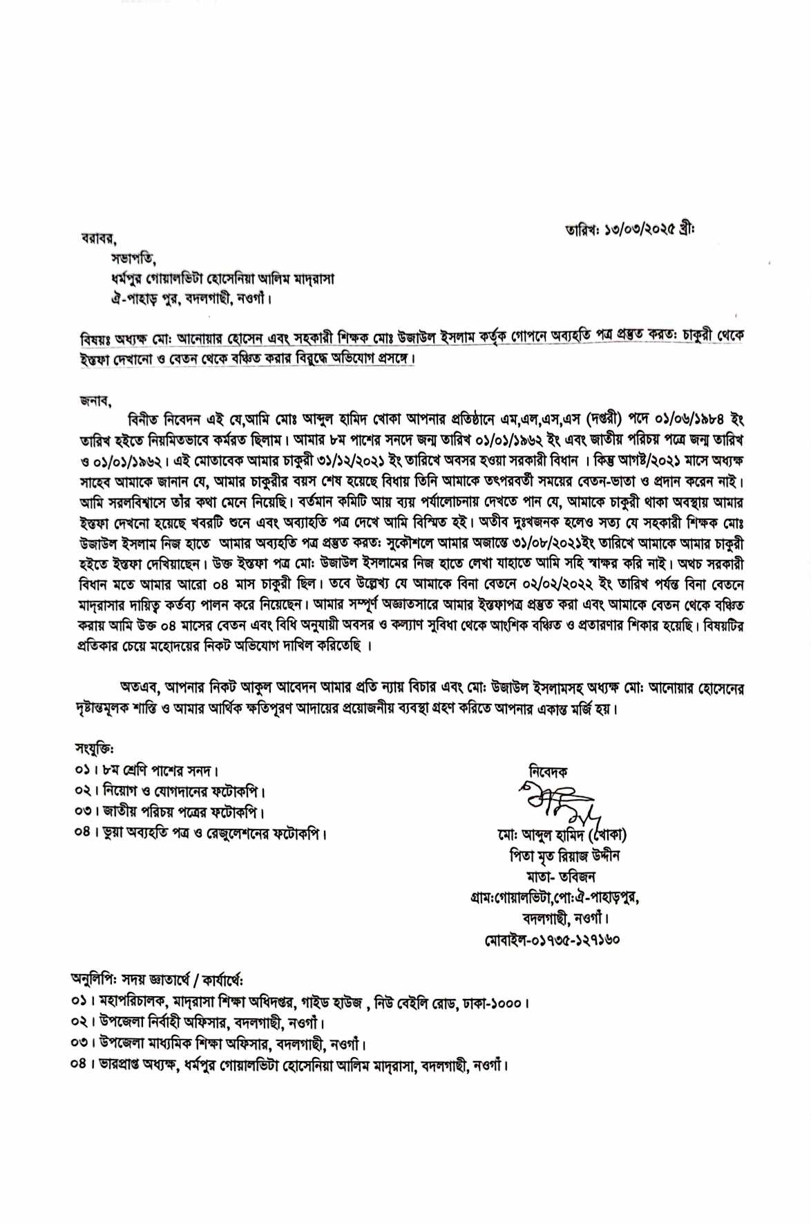 নওগাঁয় সাক্ষর জাল করে দপ্তরীকে চাকুরীচ্যুত করার অভিযোগ