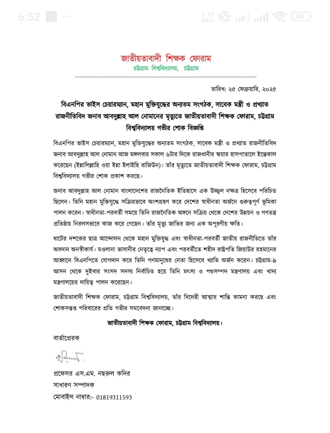 বিএনপি নেতা নোমানের মৃত্যুতে চবির জাতীয়তাবাদী শিক্ষক ফোরামের শোক
