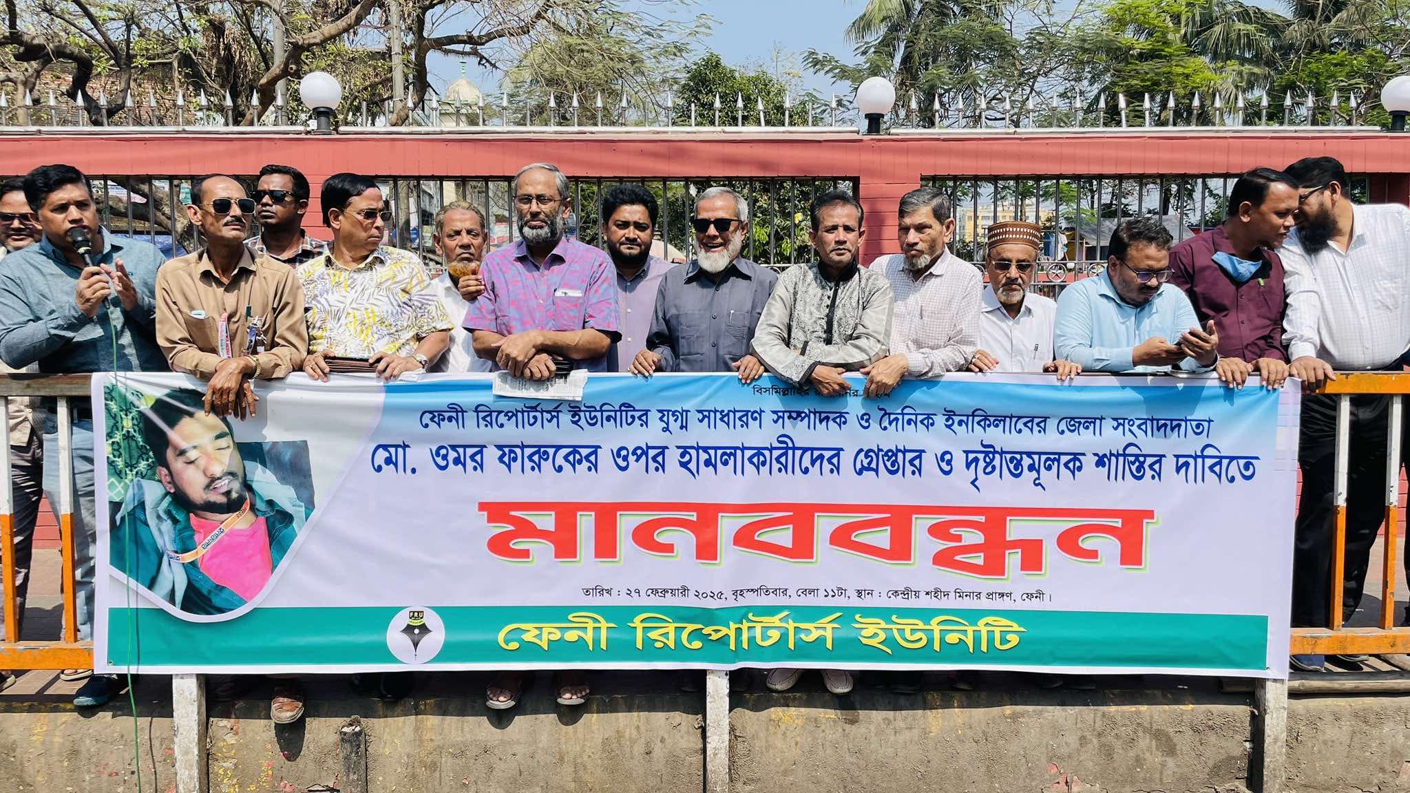 ফেনীতে সাংবাদিক নির্যাতনের প্রতিবাদে মানববন্ধন হামলাকারীদের গ্রেফতারের ৭২ ঘন্টার আল্টিমেটাম
