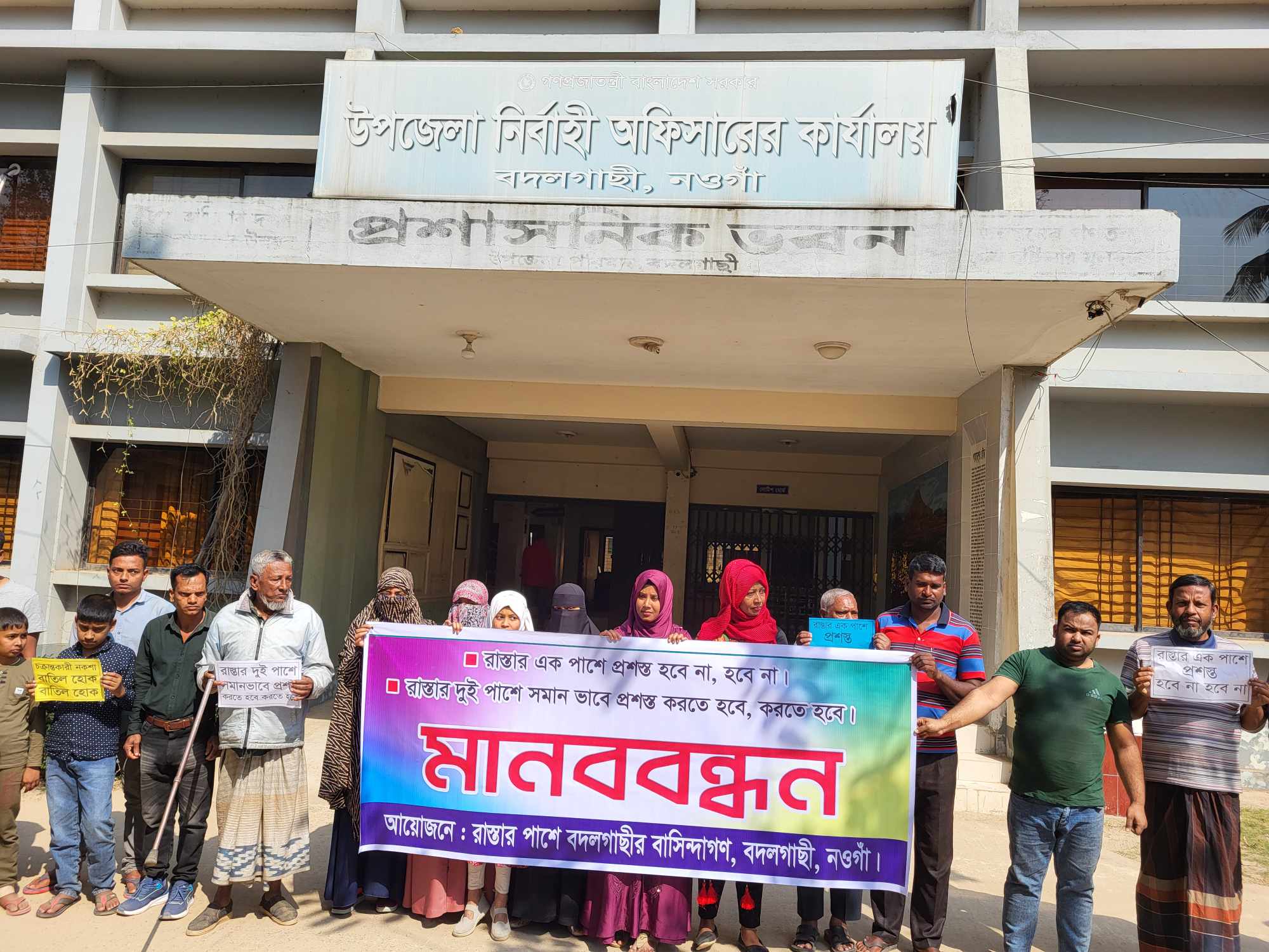 বদলগাছীতে রাস্তার জমি অধিগ্রহণে বৈষম্য করণের বিরুদ্ধে এলাকাবাসীর মানববন্ধন