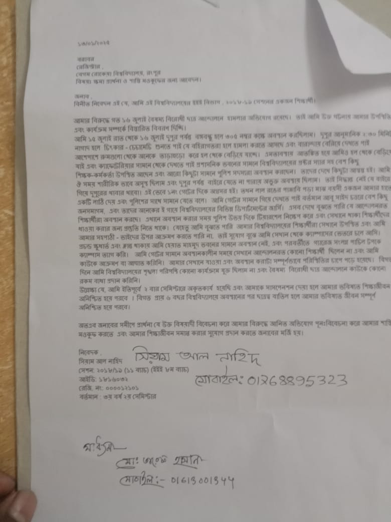 বেরোবিতে ছাত্রলীগ নেতাকে বাঁচাতে ছাত্রদল নেতার আত্মসমর্পণ পত্র